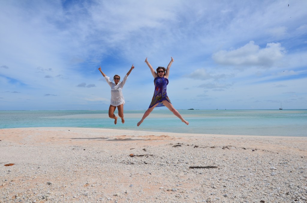 Le dimanche 21 avril, veille de notre départ, les cloches tahitiennes étaient passées dans le lagon, disséminant çà et là des « oeufs-crabes » remplis de douceurs chimiques pour la plus grande joie d’Angel Geek et MM. Pendant ce temps, les grands prenaient un apéro bien mérité. La chaleur en ce jour de Pâques était très perceptible et l’expression de « Pâques au balcon » s’est métamorphosée en « Pâques au lagon ». Et cela ne nous a pas empêchées d’immortaliser un petit saut avec Fakamoa sur une langue de sable fin, aux accents du bout du monde.
