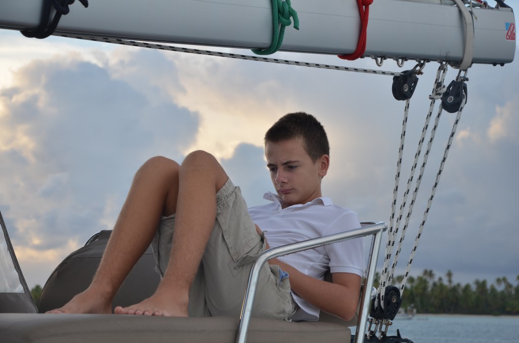 Au programme, la découverte des fonds marins de la passe avec ses 3 murs de requins et une ribambelle de poissons : un véritable ballet aquatique aux mille couleurs. Spectacle hypnotique auquel j’ai pû assister grâce au masque de Pink Vador gentillement offert par MM. Nous avons pris deux fois le courant entrant et à chaque fois la magie opérait. L’après-midi, nous étions seuls au monde sur les plages de sables roses. Les garçons ont retrouvé leurs instincts préhistoriques en ramenant deux noix de coco. C’est avec l’ancre de l’annexe qu’ils ont entrepris le débourage : épisode digne de Koh-Lanta !