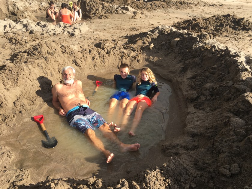 L’une des attractions locales est de creuser la plage 2h avant et jusqu’à 2h après la marée basse. Vous faites émerger des sources d’eau chaude! Et oui même en bord de mer, l’origine volcanique de la Nouvelle-Zélande n’est jamais bien loin. Les bains chauds (40 degrés mini) dans une eau gorgée de minéraux est un must de la région! Tout le monde vient donc avec sa pelle et sa serviette, même par 10 degrés dehors!