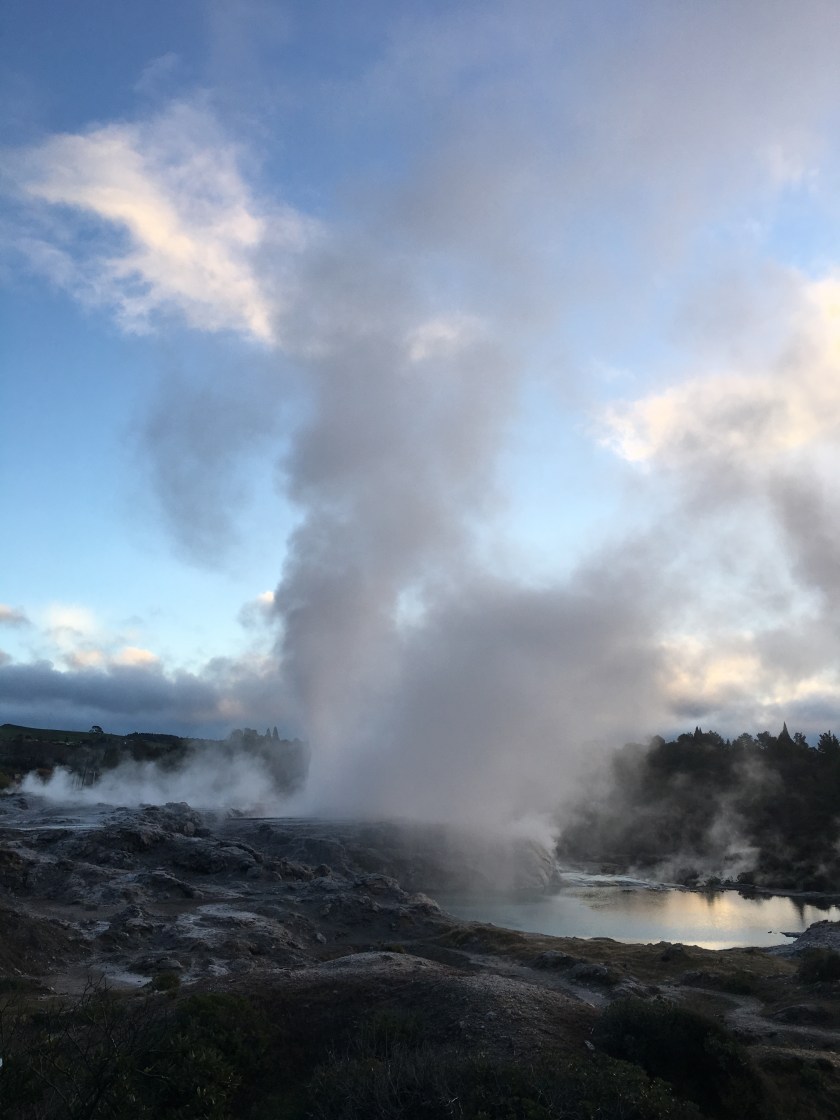 Départ ensuite pour Rotorua, son magnifique lac et ses superbes paysages volcaniques. Ici on sent la terre vivre sous nos pieds: geysers, eau sortant à plus de 90 degrés, dépôts de minéraux…mais surtout une odeur qui ne laisse aucun doute. Le souffre est présent partout!!